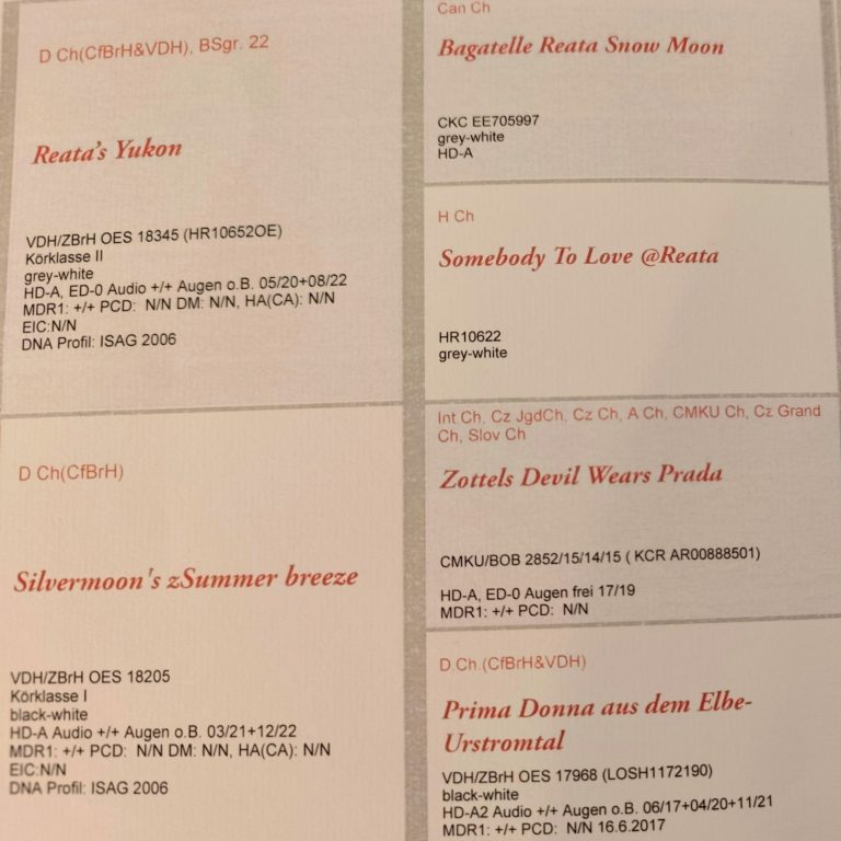 das Gehör wird getestet / BAER, es wird die Hüfte geröntgt und ein Grad bestimmt, um eine Hüftgelenksdysplasie auszuschliessen , vor Zuchteinsatz muss eine Augenuntersuchung vorliegen, des weiteren müssen unsere Hunde einen Wesenstest bestehen